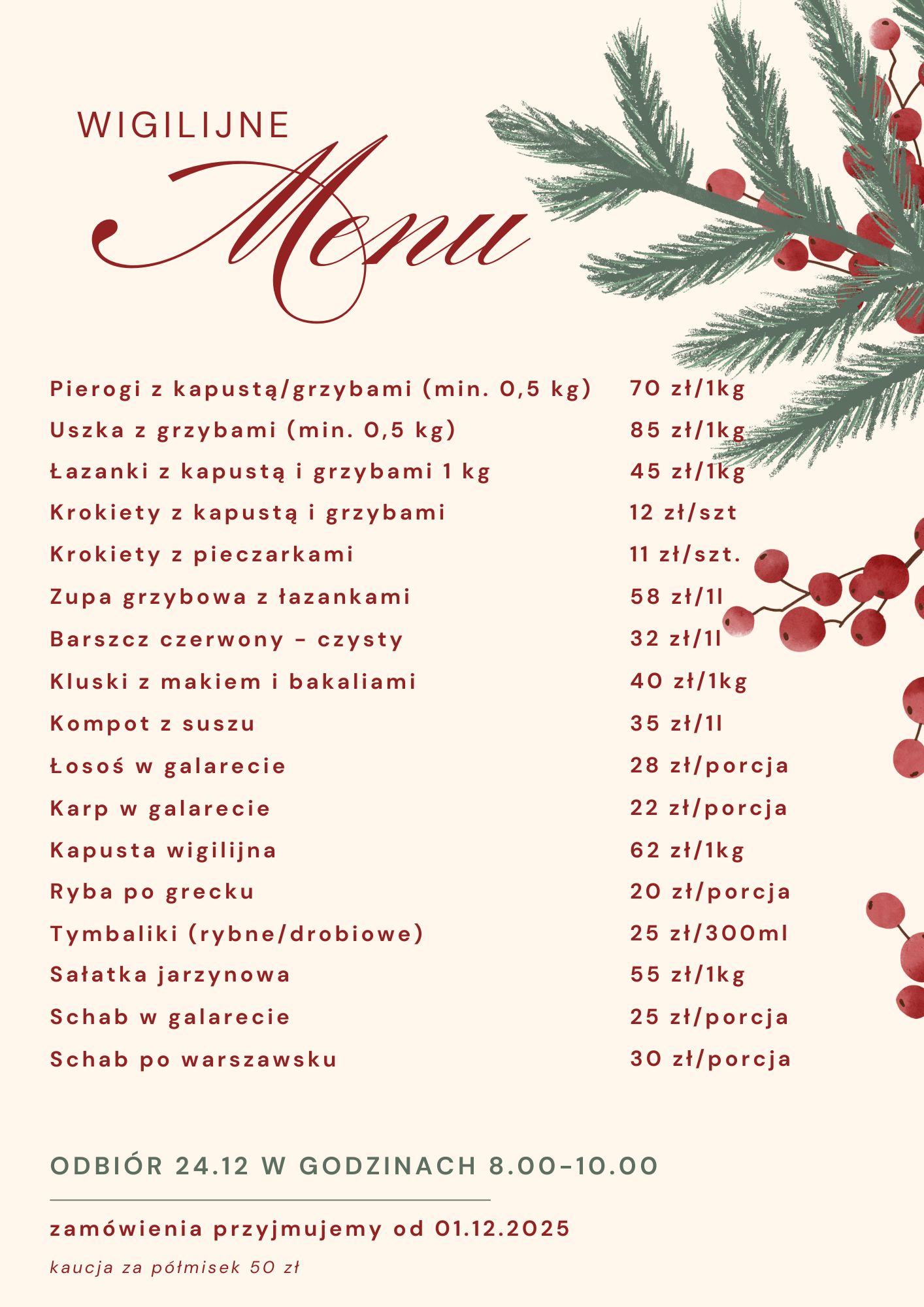 Naszym celem jest stworzenie dla Państwa takich dań, które nie tylko zachwycą smakiem, lecz także wprowadzą w atmosferę prawdziwej, rodzinnej Wigilii — pełnej ciepła i tradycji. W ofercie znajdą Państwo m.in. aromatyczny barszcz z uszkami, pierogi z różnymi nadzieniami, ryby przygotowywane na kilka sposobów, kompot z suszu oraz wiele innych klasycznych propozycji.Chętnie odciążymy Państwa w świątecznych przygotowaniach, aby mogli Państwo skupić się na tym, co naprawdę ważne — na chwili odpoczynku i radości z najbliższymi.